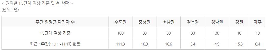 우선 수도권은 100명이상일 때 1.5단계로 격상이 가능합니다. 이어 충청권과 호남권, 경북권, 경남권은 30명 이상일 때 가능하고, 강원과 제주는 10명 이상일 때 가능합니다.
